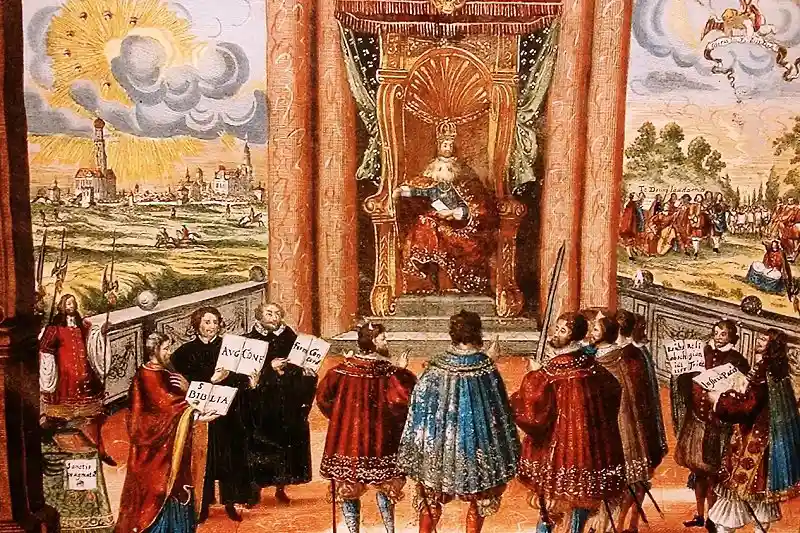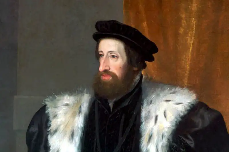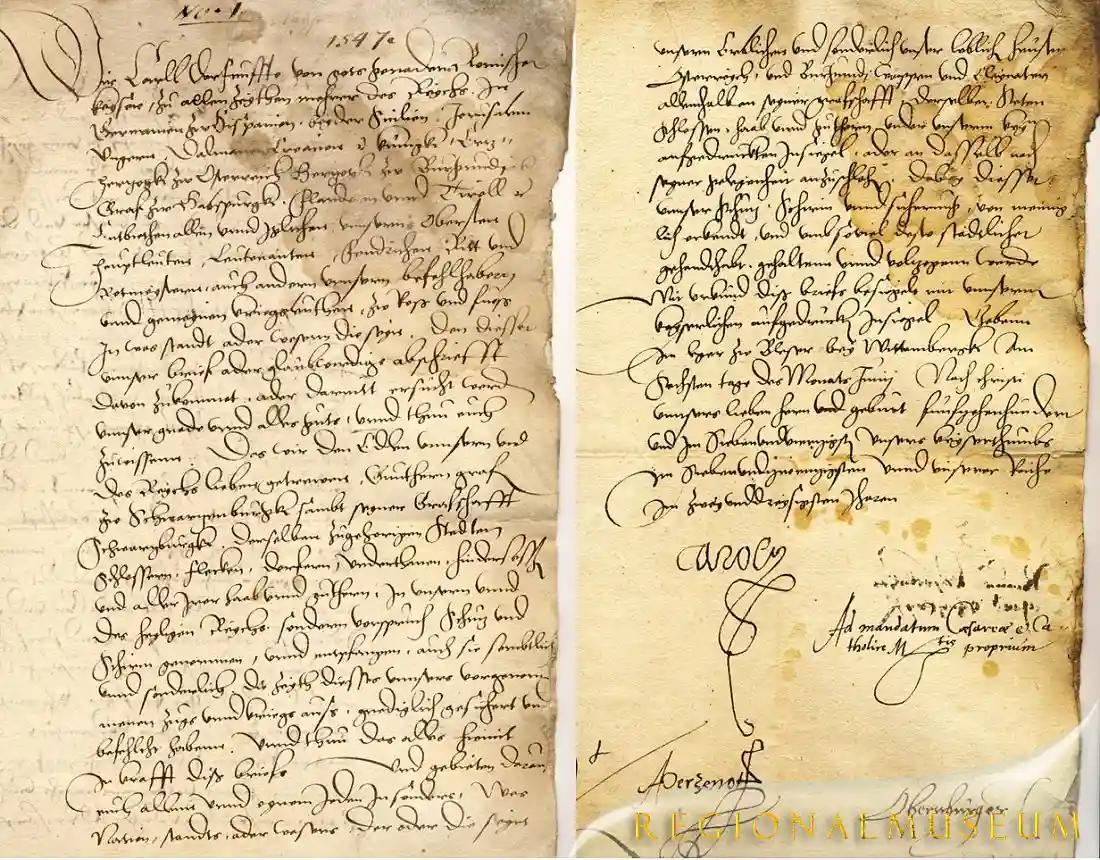 Das ist für Günther eine ziemlich harte Last. Er muss also nach Dresden marschieren und den Lehenseid schwören, damit er sein Land behalten kann. Der Kaiser ist andererseits auf seinen Höhepunkt. Er steht am Grabe Luthers in Wittenberg in der Schlosskirche. Er wird Herzog Alba nicht folgen und dessen spanischen Ambitionen, dass man dieses Grab zerstört sowie die Grablege. Das ist Überlieferung. Aber er setzt das »Augsburger Interim« auf dem Reichstag in Augsburg 1548 fest. Es heißt, es wäre eine Zwischenlösung. Die Zwischenlösung bedeutet, er ist zwar der Sieger, doch hat er auch viele Protestanten, Lutheraner, im Land.