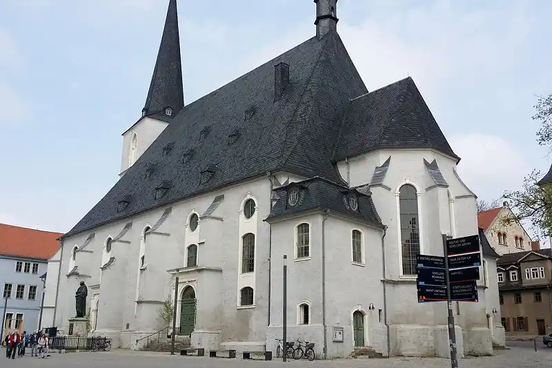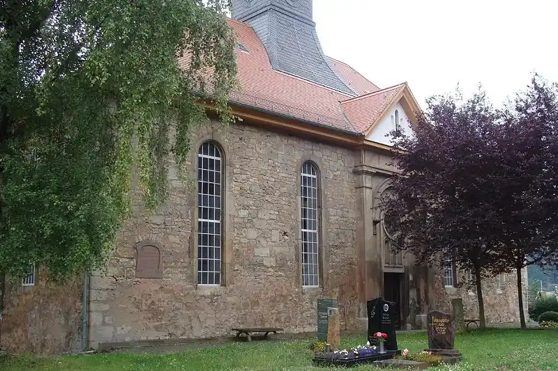 Nach der Niederlage des Kaisers wird der »Passauer Vertrag« ausgearbeitet. Protestanten und Katholiken nähern sich hier an, in Person von Kurfürst Moritz und König Ferdinand. Es ist eine Vorstufe zum Ausgleich. Aber diesen Ausgleich wird dann Moritz nicht mehr erleben. Das passiert aber Vorort. 1552 als der Kaiser verliert, ist Graf Günther auf einmal voll bei der Sache. Lutherisch durch und durch, auf seine letzten Lebenstage. Das macht er besonders deutlich, indem er z.b. im Chorherrenstift in Jechaburg einen Lutherischen Dechanten einsetzt. Er zeigt demnach nach außen deutlich, im diesem Stift in Jechaburg verläuft nun nichts mehr nach katholischen Ritus. Man sieht hier die Pfarrkirche St. Peter und Paul in Jechaburg.