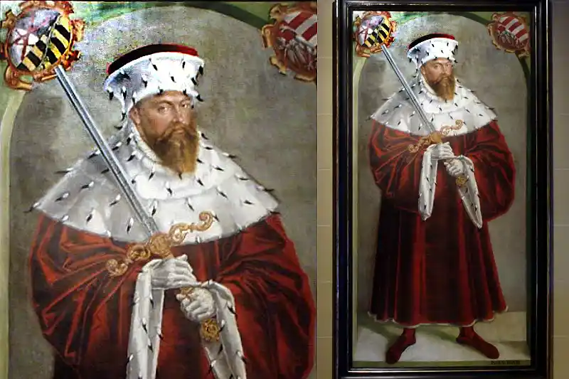 Sichtbar ist das z.B. in Dresden im Schloss in der Rüstkammer. Johann Friedrichs Rüstung, sein Pferd im Vordergrund, das neue Kurschwert für seinen Vetter, Herzog Moritz, der nun Kurfürst wird. Eindeutiger kann man es auch nicht darstellen. Die Kurwürde wechselt den Besitzer.