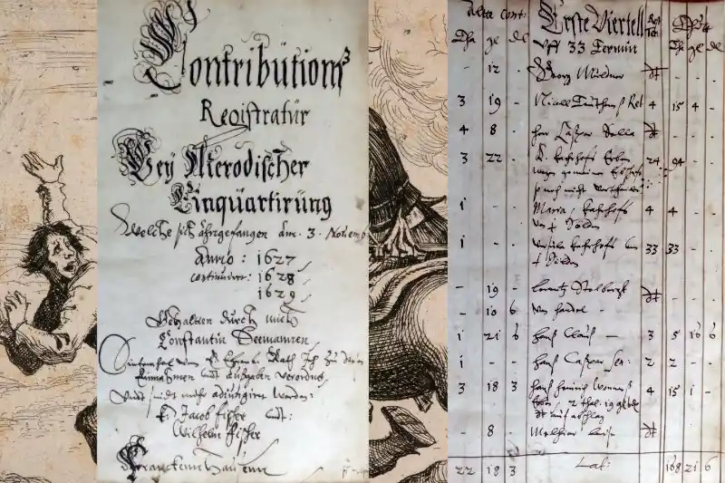 In einer sogenannten »Kontributionsakte« aus dem Frankenhäuser Stadtarchiv befindet sich ein Register über die Truppen des Grafen Jean de Merode, die mehrere Jahre ab 1626 durch unser Gebiet ziehen und es bis ins Jahr 1629 hinein besetzen. Hier wird das erste Mal aufgeführt, wer welche Geldbeträge zu entrichten hat, die Kontribution. Es wird einfach befehligt, die Stadt hat 1000 Taler zu bringen. Daraufhin werden die 1000 Taler auf die Bevölkerung umgelegt, und jeder hat entsprechend seinen Beitrag zu löhnen. Das gilt ab diesen Zeitpunkt jahrein jahraus, egal wer kommt. Hier ist aber das allererste mal aufgeführt, wie diese Truppen »agierten«.