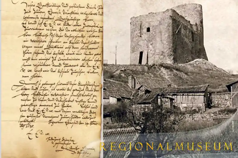 Die Esperstedter machen sich alsdann an den Wiederaufbau und im Jahre 1636 haben sie ihre Kirche wieder errichtet. Sie haben jedoch ein weiteres Problem - auch die Glocke wurde zerstört. In einem Schriftstück, auch bei uns im Bestand des Stadtarchives, bitten sie die Stadt Frankenhausen, ob sie möglicherweise die Glocke des Hausmannsturms bekommen könnten. Bei dieser handelt es sich allerdings nicht um eine Kirchenglocke, sondern die Glocke auf dem Hausmannsturm ist die Alarmglocke für die Meldung der Brände im Salzwerk. Um diese Glocke geht es nun in diesem Schriftstück. Aber diese Glocke bekommen sie nicht, weil die Frankenhäuser fürchten, dass sie dann dort oben keine Glocke zur Meldung eines Brandes haben.