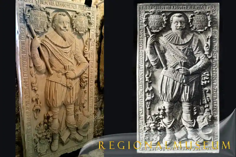 Also eine rein private Angelegenheit, wenn man so will. Und nun kommt etwas Interessantes hinzu. Mit diesen Truppen von Herzog Georg kehrt ein Mann zurück nach Frankenhausen: Johann Meyer, der hier geboren wurde. Die Original-Grabplatte, befindet sich heute in der Unterkirche.