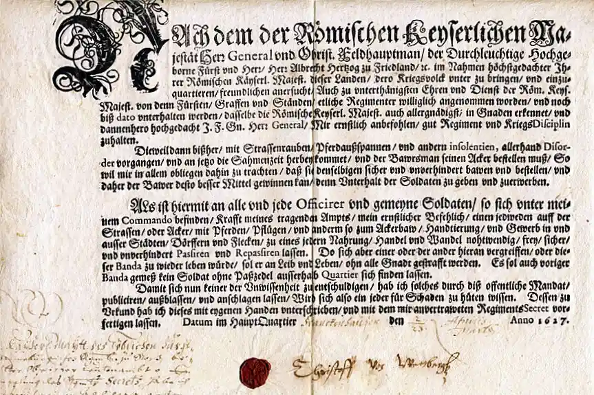 Dann haben wir immer vor Augen – Wallenstein, er verbindet sich damit, dass der Krieg den Krieg ernährt. In einem Schriftstück im Namen des Kaisers für Wallenstein ausgestellt, erhält er das Privileg, welches ihn ermächtigt, einerseits für Ruhe und Ordnung zu sorgen, aber andererseits bestimmte Dinge zu verlangen, d.h. er kann Kontribution erheben, er kann Einquartierungen vornehmen usw.