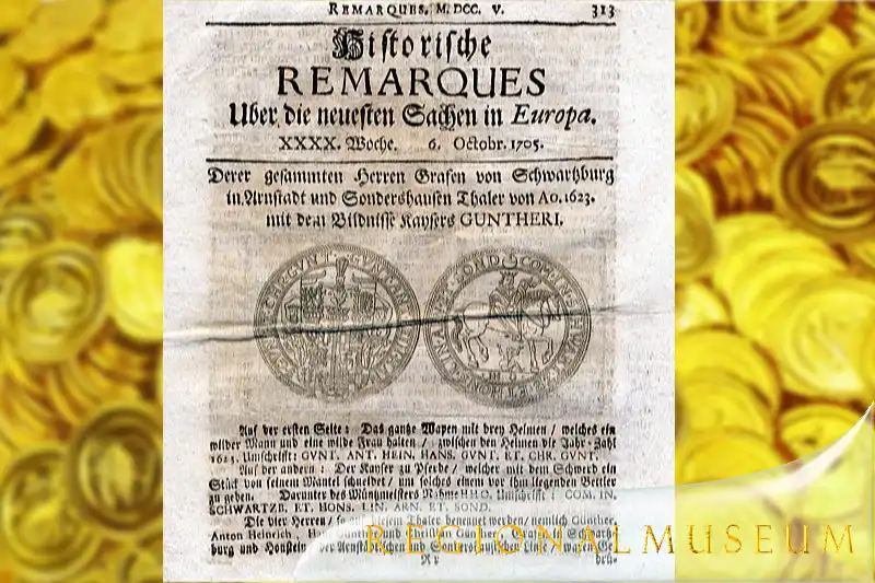 Auch die Schwarzburger im Raum Frankenhausen/ Sondershausen prägen später wieder entsprechend gutes Geld mit hohem Silberanteil. Und 1623 wird ein Taler für das gesamte Schwarzburgische Gebiet einschließlich Arnstadt-Rudolstadt geprägt. Er zeigt innen ein Attribut der Schwarzburger. Im Jahre 1349 hatten sie einst einen deutschen König gestellt, wenn auch nur als »Gegenkönig« - gegen Karl IV. . Dieser Gegenkönig Günther von Schwarzburg wird nun darauf abgebildet. Es ist der sogenannte »Königstaler«, bei den Schwarzburgern somit ein besonderer Wert eines neuen Geldstücks.
