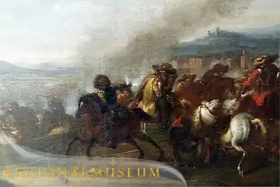 Er trägt eine Kette mit einigen Medaillonbildnissen. Er verweist mit einem Finger auf ein Medaillon. Das ist niemand anderes, als König Siegesmund III. Wasa von Polen. Bei Wasa werden vielleicht einige stutzig; er stammt aus dem gleichen Haus, wie der Schwedenkönig Gustav Adolf. Die haben miteinander Krieg geführt, d.h. unser Johann Meyer hat im Dienste der Polen bereits gegen Schweden gekämpft, bevor überhaupt der Schwede hier ins Gebiet hereinbricht. Der Schwede greift bekanntlich erst nach einem Waffenstillstand mit den Polen in den Krieg mit Deutschland ein.