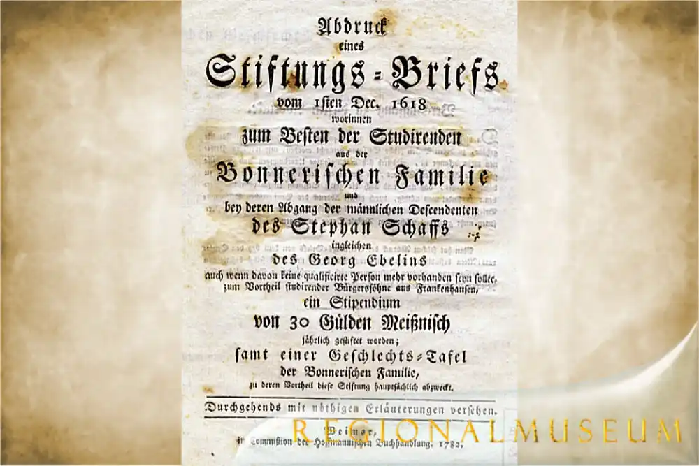 Eine Bonnersche Stiftung, eigentlich eine Familienstiftung, aber später dann auch für andere Frankenhäuser, die studieren und höhere Schulen besuchen wollen, bietet diese Geld als Unterstützung an. Dieser Stephan Bonner wird auf dem »Blauen Hof« in Ichstedt Erbherr. Er bekommt ein höheres Gut. Ab 1634 wird er gar schwarzburgischer Kanzler und Vorsitzender des Konsistoriums. Und diese beiden, der Hauptmann von Gehofen und Stefan Bonner, werden weitestgehend die »Staatsgeschäfte« führen. Von den Schwarzburger Grafen hingegen werden wir in Frankenhausen kaum etwas vernehmen.