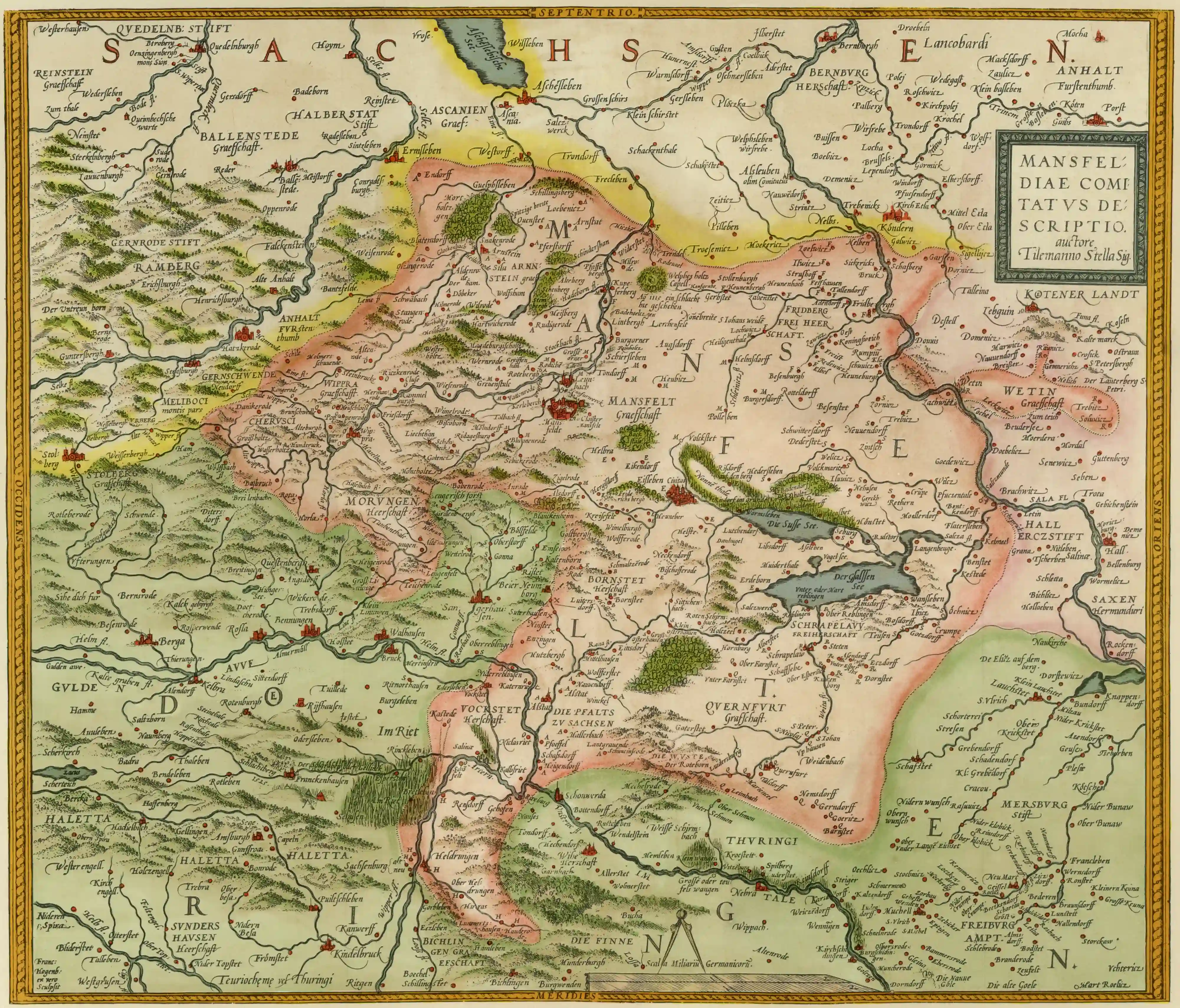 Das vorliegende Blatt ist erstmalig 1573 im Atlas von Ortclius erschienen 2, hat aber eine viel längere Geschichte, auf die kurz eingegangen werden muss. Zwischen 1550 und 1560 hat Tilmann Stella 3 eine Landesaufnahme der Grafschaft Mansfeld gemacht, die er nicht publizierte, weil er aus den Vermessungen verschiedener Länder eine neue Deutschland-Karte, sicher in einer größeren Anzahl von Blättern, herausgeben wollte. Dazu ist er aber nie gekommen, und fast das ganze Material ist nach seinem Tode beim Brande des Schlosses von Zweibrücken in der Pfalz 1675 verlorengegangen. Den Gedanken zu diesem großen Unternehmen fasste er wohl bei der Bearbeitung der Deutschland-Karte von Sebastian Münster, die er ab 1560 in Wittenberg mehrfach publiziert hatte. 4