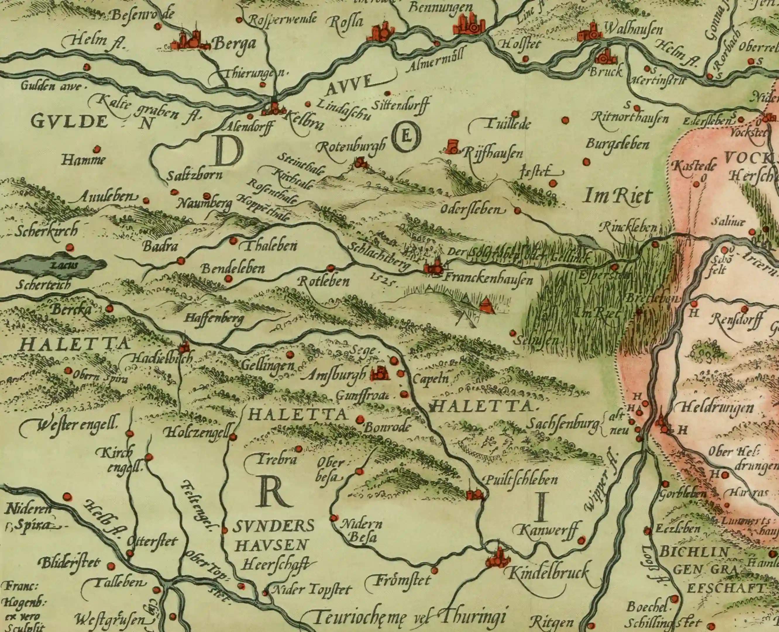 Die Hainleite wird durch den latinisierten Namen »Haletta« wiedergegeben. Aus der Frühzeit der Besiedlung werden die Namen legendärer Volksstämme angegeben. Besonders eindringlich aber ist die Darstellung der geschichtlichen Ereignisse der Schlacht von Frankenhausen.