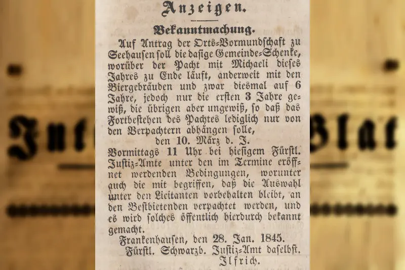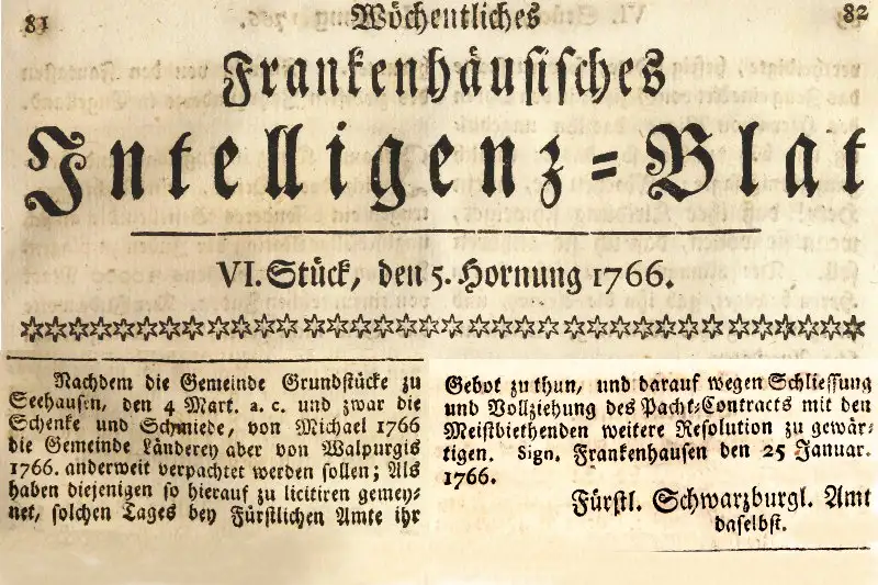 Was Seehausen darüber hinaus noch zu bieten hat: Die »Schänke«, die hier im »Frankenhäuser Intelligenzblatt« von 1766 genannt wird. Sie gehört zu den ältesten Gasthäusern, die in dieser Frankenhäuser Zeitung oder einer der Frankenhäuser Zeitungen genannt werden. Die Zeitung, die älteste, stammt vom Januar 1765, und hier haben wir den Februar 1766 vorliegen, in der nun jene »Schänke« genannt wird, die in der Gemeinde in Seehausen verpachtet werden soll. Sie ist somit eine der ältesten Ankündigungen in einer Zeitung für eine Schänke überhaupt. Zumindest aus schwarzburgischen Gebiet gehört diese Ankündigung zu den Ältesten.
