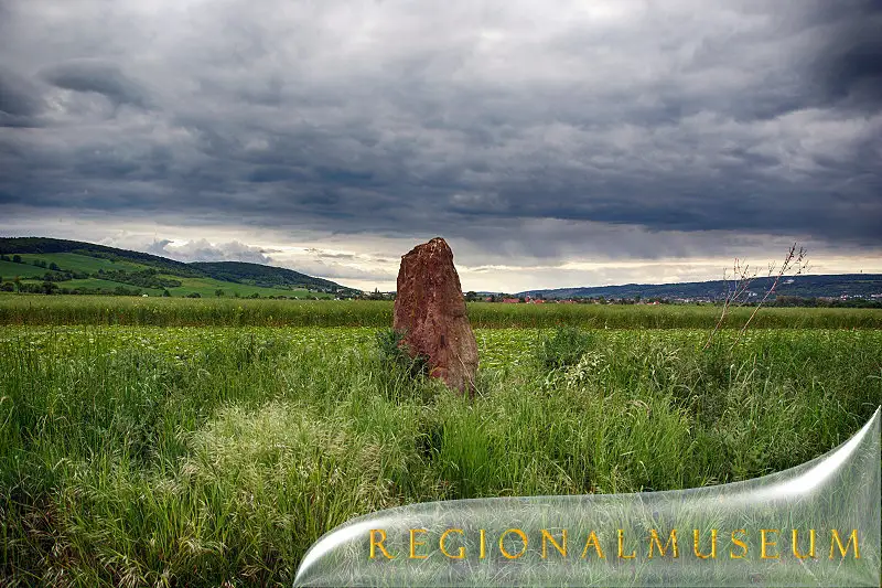 Außerdem haben wir eine Besonderheit in der Landschaft. Etwa an der Stelle, an der Oldisleben und Seehausen getrennt sind, nämlich durch den alten Grenzstein Schwarzburg-Rudolstadt in Richtung Großherzogtum Sachsen-Weimar-Eisenach. Und von diesem Grenzstein nördlich etwa 100 Meter hinein ins Feld steht der älteste Menhir Mitteldeutschlands, rund 5.000 Jahre alt, wahrscheinlich ein Kultstein (Bild 6).