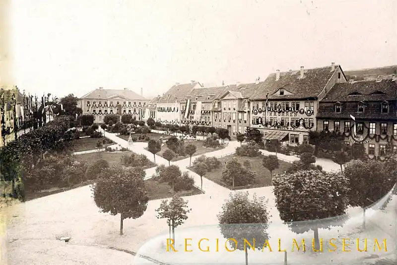 Von Werners Garten aus gelangen wir, der Chaussee abwärts folgend, nach kurzer Zeit bis zum Eingang der Stadt. Wir gehen über eine Brücke und wenden uns links, lassen die Gottesackerkirche und den alten Kirchhof zur Rechten liegen und erreichen bald darauf einen freien, durch Schmuckanlagen verschönerten Platz, wie ihn manche Großstadt nicht schöner besitzt. Das ist der Anger. Von den daran liegenden Häusern sind bemerkenswert das städtische Realprogymnasium an der Westseite, der Gasthof zum Mohren an der Nordseite, die Apotheke und der »Thüringer Hof (1/3)« an der Ostseite.