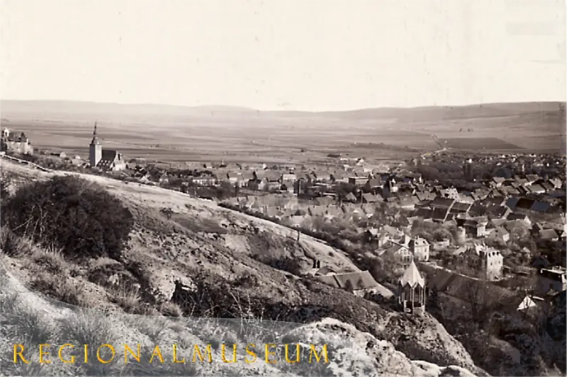 Beim Abwärtssteigen auf diesem Wege haben wir fortwährend einen schönen Überblick über die ganze Stadt sowie über das ganze Thal südöstlich und östlich mit seinen Dörfern und seiner Bergumgrenzung. Nachdem wir etwa die Hälfte des Weges zurückgelegt haben, bemerken wir links, ein Stück oberhalb desselben, eine kreisrunde, aus roten Sandsteinen aufgemauerte Plattform, die jetzt schon anfängt zu zerfallen und wie geschaffen dazu erscheint, dem Zeichner und dem Maler als Standpunkt zu dienen wenn er von der Stadt und ihrer Umgebung ein schönes Bild entwerfen will. Dies ist die alte Richtstätte, auf der vor etwa 60 Jahren die letzte öffentliche Hinrichtung stattgefunden hat. Von ihr trägt der ganze Berg, an dem wir abwärts gestiegen sind, und der jetzt durch eine einträgliche Kirschbaumpflanzung ein freundliches Aussehen gewonnen hat den Namen Galgenberg.