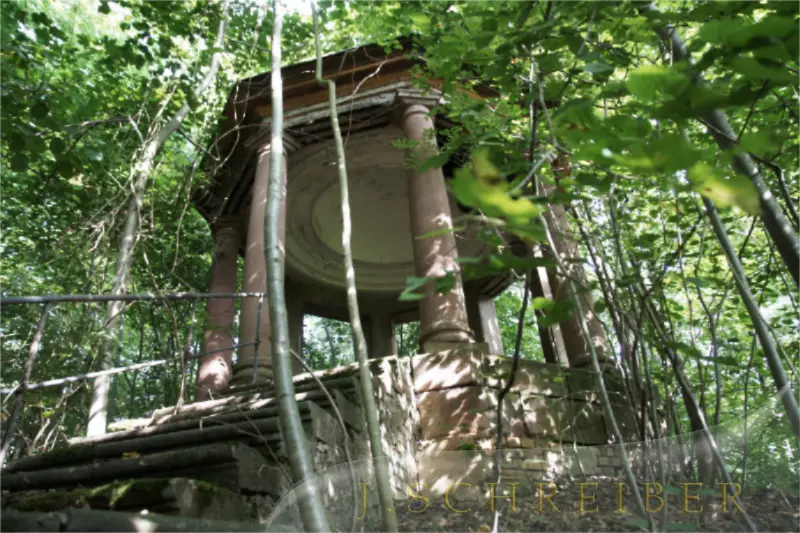 Drehst Du Dich nun mal um und wendest Dein Gesicht nach Nordwest, so bemerkst Du ein kahles, mit dürftigem Graswuchs bedecktes und allmählich ansteigendes Plateau, hinter welchem der Wald wieder beginnt. Dicht vor demselben aber liegt ein langgestrecktes Gebäude, von dessen höheren Mittelerker eine blau-weiße Fahne lustig im Winde flattert. Das ist Mehlers Waldschlösschen, eine von den Frankenhäusern, den Badegästen und Touristen viel und gern besuchte Berg- und Waldwirthschaft, der wir nachher auch noch unseren Besuch abstatten werden. Vorher wollen wir aber noch etwas die Schönheiten des Waldes genießen, deshalb kehren wir wieder zu dem Wege, den wir heraufgekommen sind, zurück und verfolgen ihn weiter. In vielen Biegungen und Windungen führt er uns durch so dichten Buchenhochwald, dass nur selten ein Sonnenstrahl durch das Laubdach hindurchfallen kann.