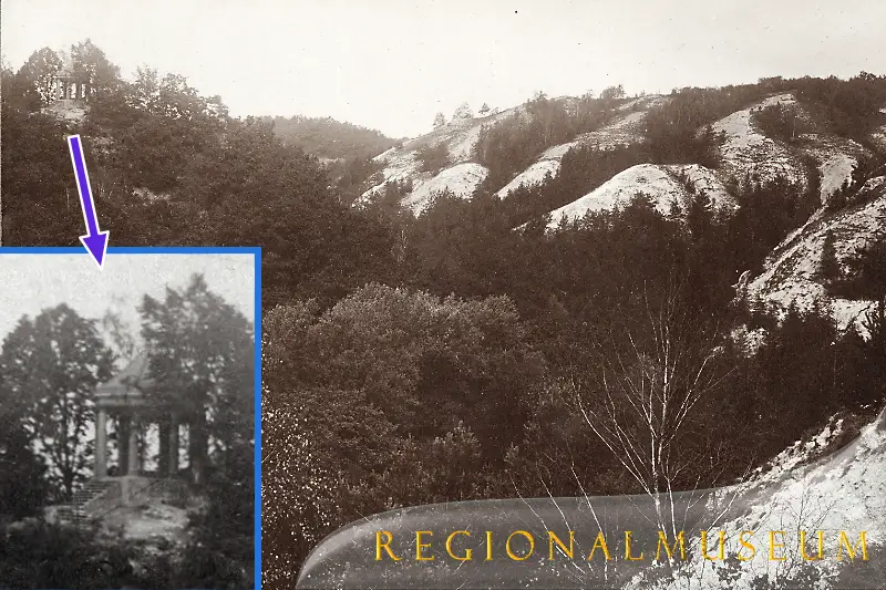 Bald darauf erreichen wir bei einer Selterswasserbude, deren Hebe uns freundlich anlächelt, die Chaussee von Frankenhausen nach Kelbra, welche die Anlagen durchschneidet. Wir biegen rechts in dieselbe ein und verfolgen sie aufwärts in nordwestlicher Richtung. Da, wo die Anlagen aufhören, bemerken wir links an einem sanft ansteigenden Berghange einen vorzüglich gehaltenen und an allerlei Zwergobst reichen Garten mit einem hochgelegenen Gartenhäuschen in griechischem Stil, und hinter dem Häuschen terrassenartig ansteigende Parkanlagen. Zur Rechten erhebt sich ziemlich steil ein aus grauem und weißem Gypsgestein bestehender Berg, an dessen Fuße mehrere zur Ablagerung und Aufbewahrung von Bier dienende Felsenkeller in das Innere getrieben sind, die oft weithin durch Hefegeruch ihren Zweck dem Vorbeigehenden verraten, während oben von der Höhe ein kleines Aussichtshäuschen und nicht weit davon eine hohe, mit den schwarzburger Farben blau-weiß geschmückte Flaggenstange herabgrüßen