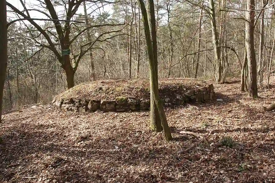 Wir schreiten auf der Chaussee weiter, die bald darauf wieder nach rechts macht und nach dieser letzten Biegung auf eine längere Strecke hin nordöstliche Richtung behält. In der Nähe des Kilometersteins 3,6 ist rechts von der Straße an der steilen, aus rotem Sandstein bestehenden Böschung eine aus demselben Material hergestellte Bank angebracht, und einige Schritte weiter befindet sich links in der die Straße begrenzenden Buchenhecke eine Lücke. An dieser Stelle führt links ein Fußweg abwärts, der die folgende scharfe Biegung der Chaussee abschneidet und den Weg um eine bis zwei Minuten kürzt. Dieser Fußweg, der hier in der Umgegend die »Kniebreche« genannt wird, führt allmählich in ein Thal, welches die Chaussee umgeht, wendet sich dann links und steigt wieder an, schneidet einen Fahrweg und geht nun eine kurze Strecke ziemlich steil aufwärts, bis er oberhalb des Kilometersteins 4 durch eine Lücke der Buchenhecke wieder auf die Chaussee mündet.