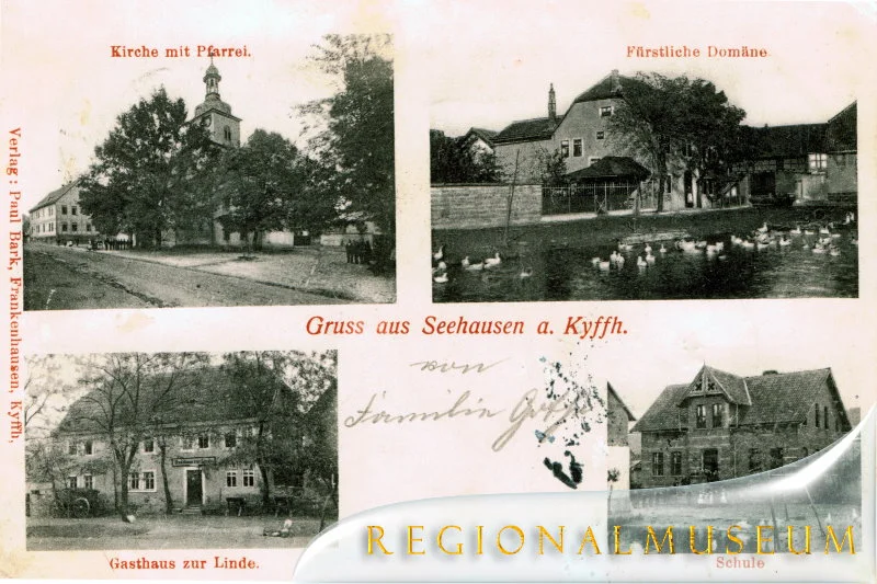 Hier etwas Dorfidylle (Bild 3). Gruß aus Seehausen. Wir blicken auf den Teil der fürstlich-schwarzburgischen Domäne außerdem auf die Kirche mit der Pfarrei, einschließlich das Gasthaus »Zur Linde«, und sogar einen Teil der Schule.